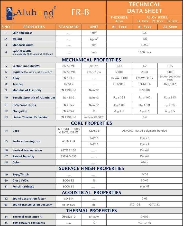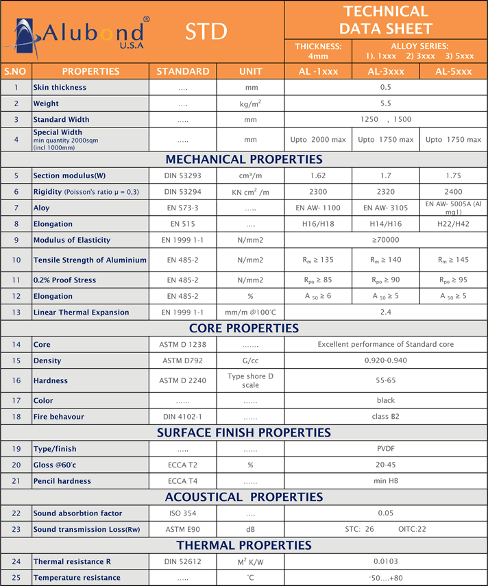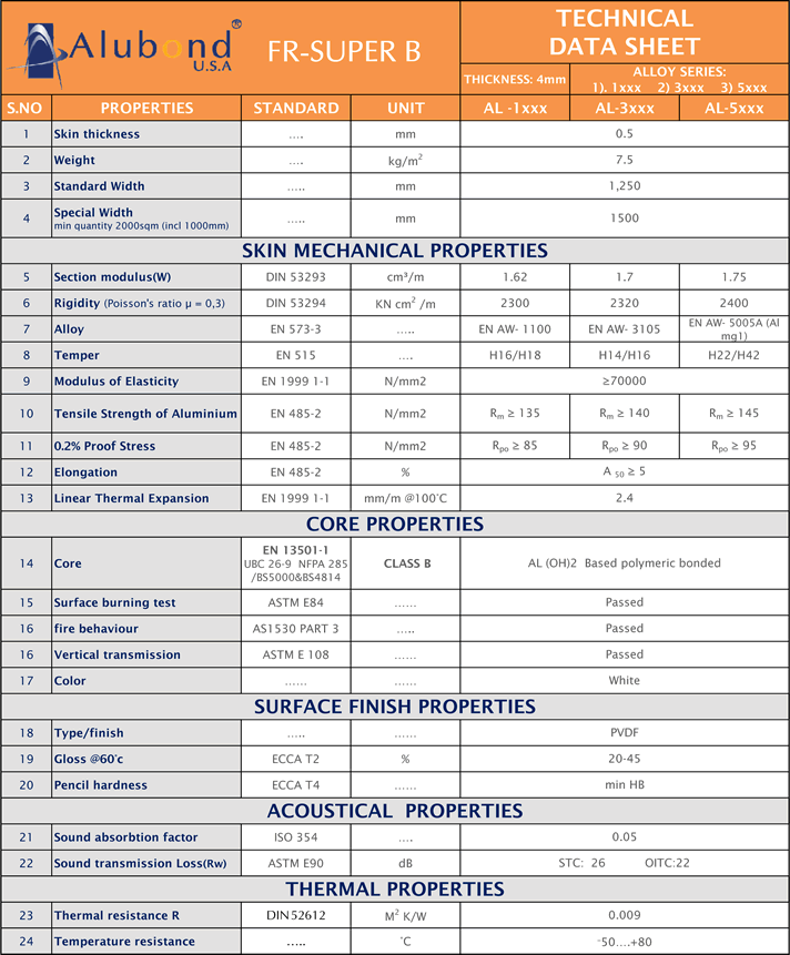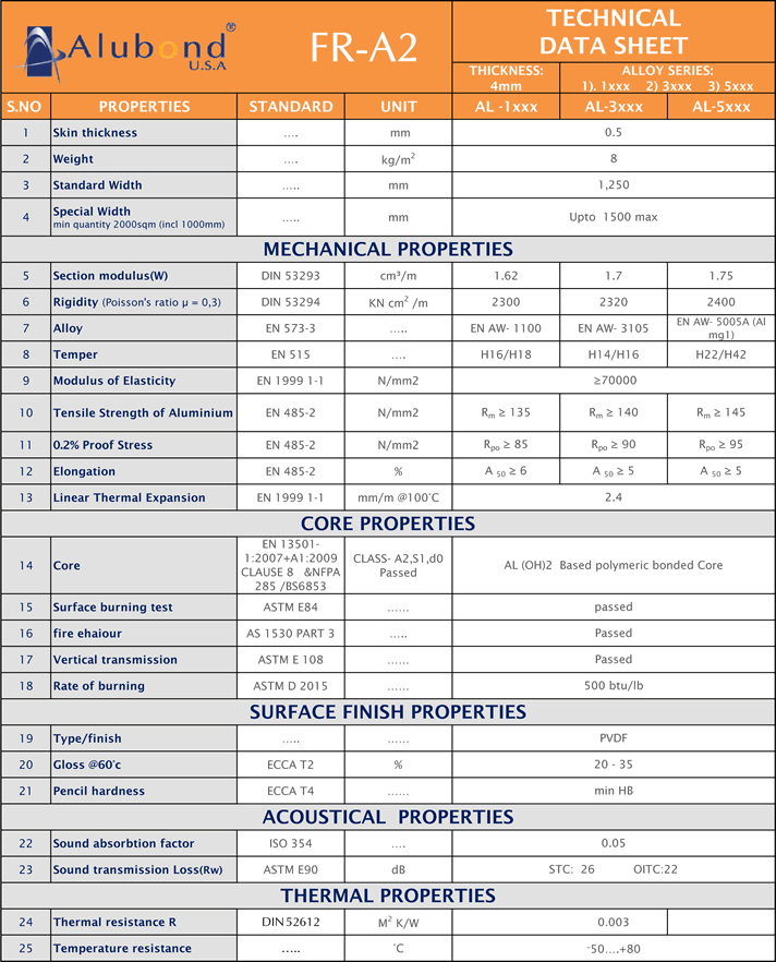 With a wide range of selection in PVDF coatings and Innovative Thermal Reflective Solar Cool Coatings, Alubond U.S.A SOLID offers aluminum panels of thickness 2mm & 3mm with the following attributes: