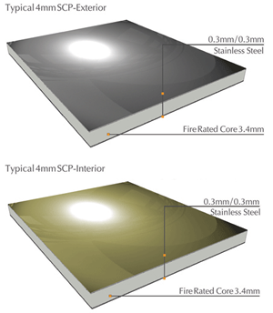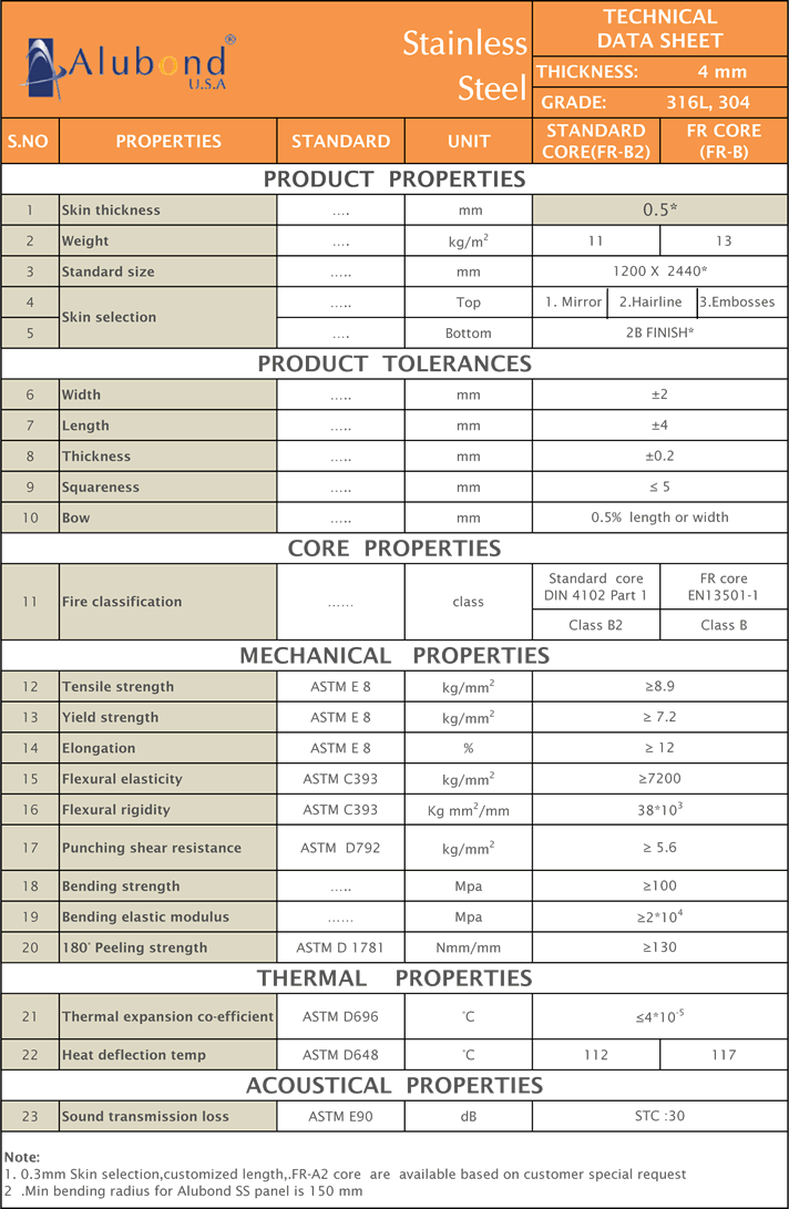 Alubond U.S.A Stainless Steel Composite Panel is made of fire rated core, sandwiched between stainless steel sheets in grade 304 or 316 in thickness 0.3 mm. For exterior usage, top and bottom coils are both in stainlesssteel. For interior applications, economical options of aluminum, Aluzinc, Galvanized Steel as bottom skin in combination of stainless steel on the top is available.